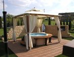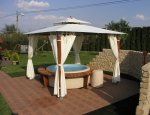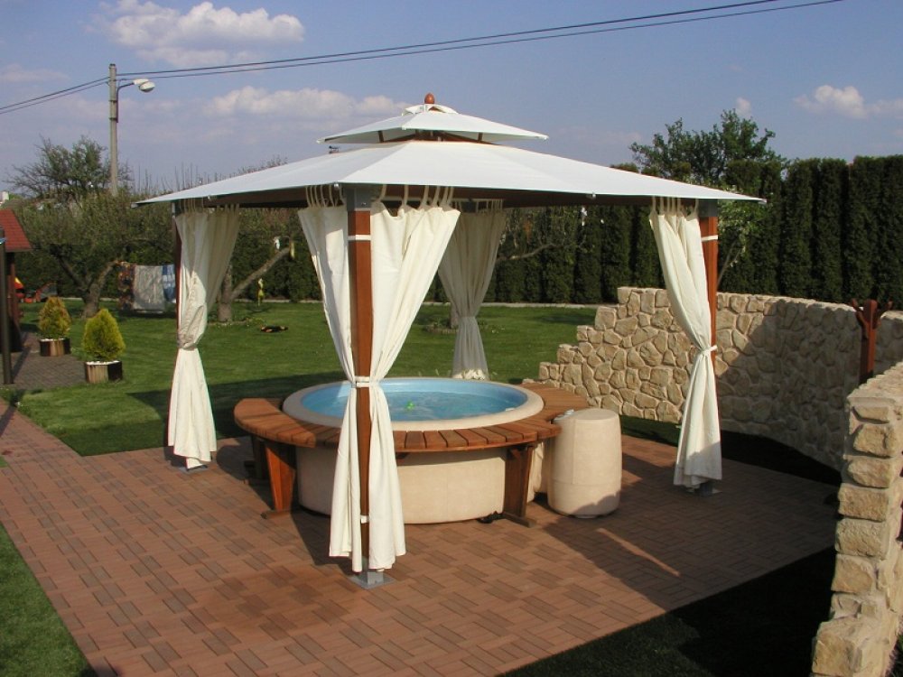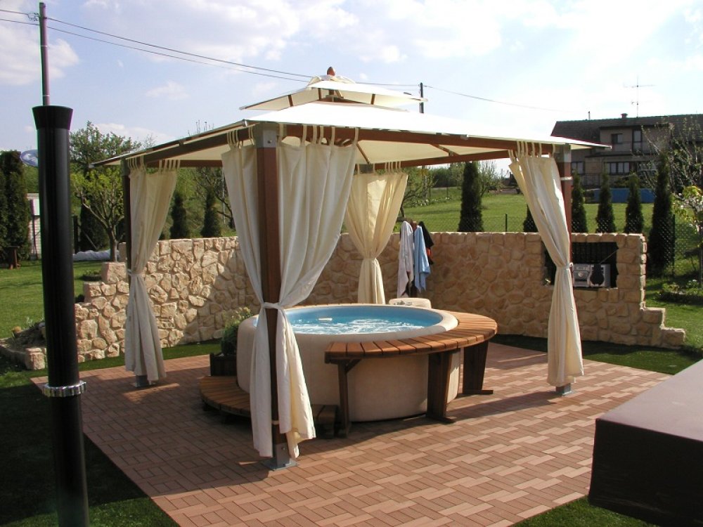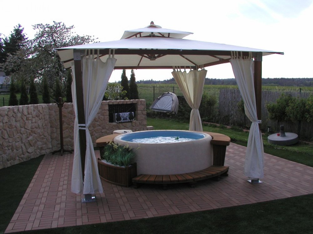 Na foto je vidět altán Gazebo, který chrání majitele vířivky před sluncem a nepřízní počasí. Altán lze zakoupit v našem eShopu v sekci zahradní nábytek. Altán s vířivkou jsou umístěny na malé terase uprostřed krásné malé zahrady.