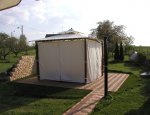 Na foto je vidět zatažený Altán Gazebo. Boční stěny altánu jsou zahrnuty v ceně. Altán je umístěn na kazetách WPC.