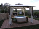 Altán LaCasaNova Gazebo rozměr 3 x 3m, barva potahu přírodní. Altán lze zakoupit v našem eShopu. Pod altánem vířivka Softub Resort 300+ v barvě Almond, dřevěné obložení redwood. Pod Altánem bezúdržbové terasové kazety WPC.