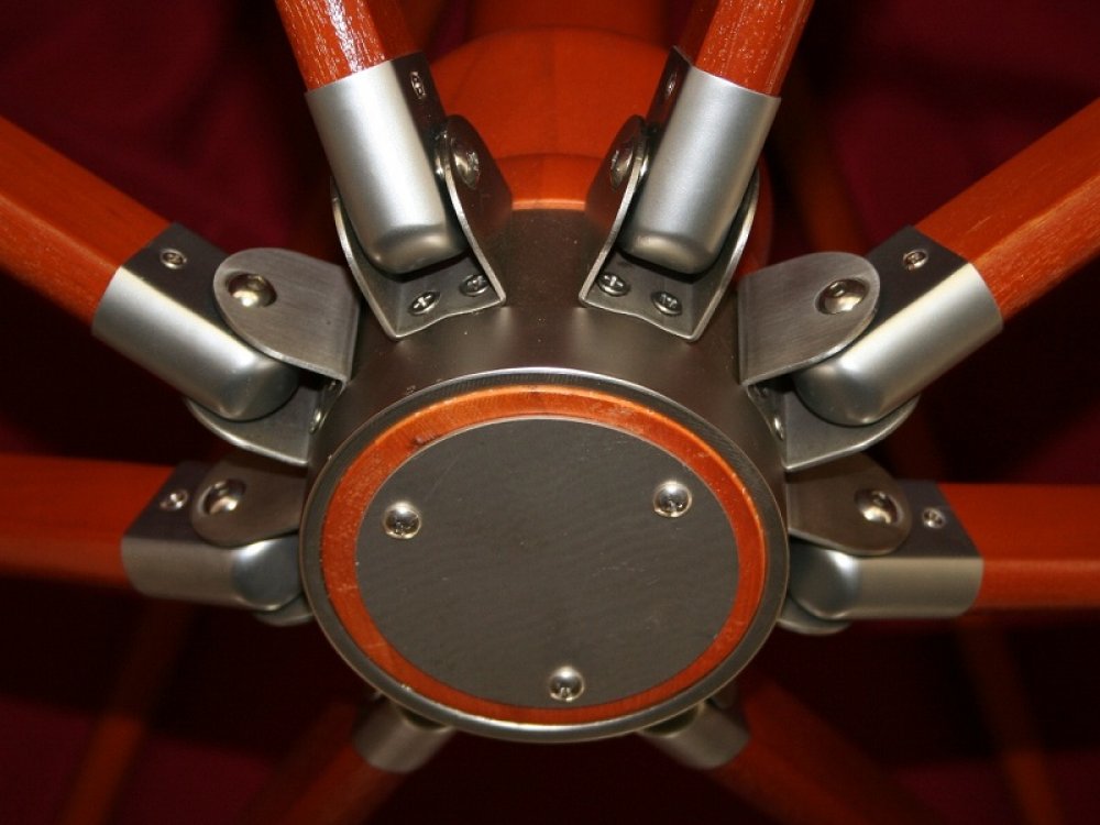 Detail konstrukce altánu. Na foto kombinace kvalitního kovu a exotického dřeva.